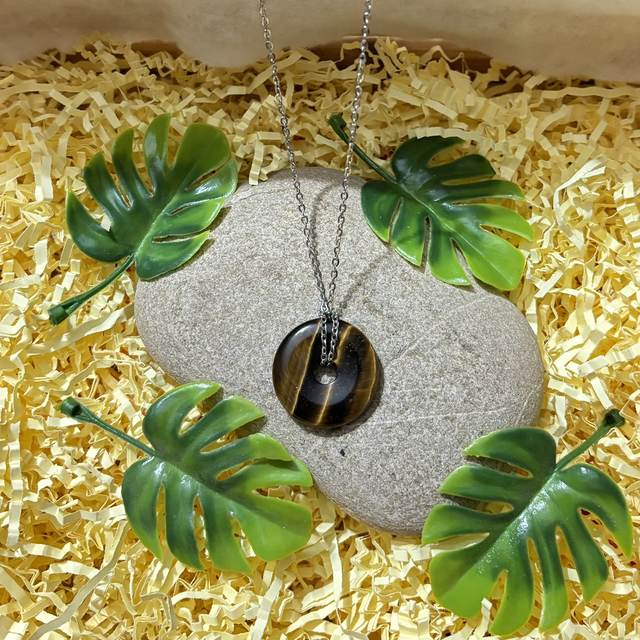 collier en chaîne acier inoxydable réglable et pendentif en oeil de tigre véritable.